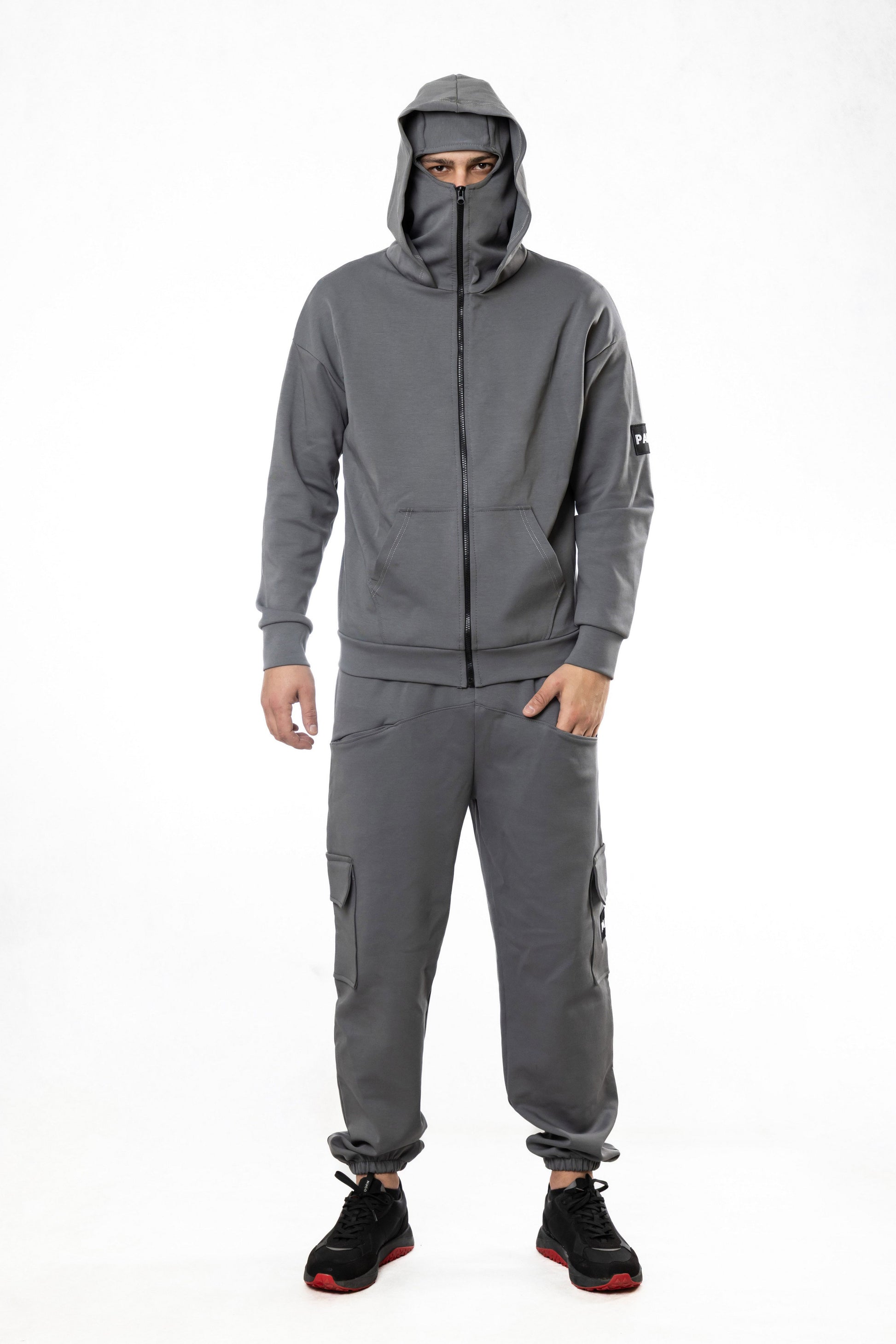 Екип с вградена ски маска. Изработен от 320 GSM double-faced материя от памук и ликра за стабилност, еластичност и издръжливост. С двойна качулка, метален преден цип и интегрирано покритие за лице за допълнителен контрол и защита. Завършен с два ANON баджа – на рамото и на джоба на крака.